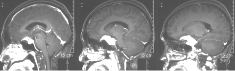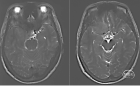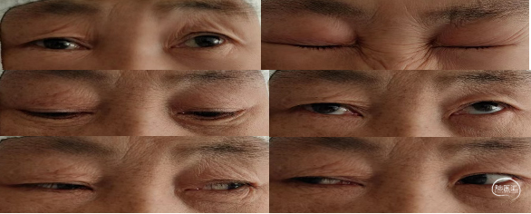 女性,50岁 主诉:头疼头晕半年,右眼视力下降2月 既往史:体健 查体:视力右0.5,左0.8,右眼眼睑上抬无力,眼裂变窄