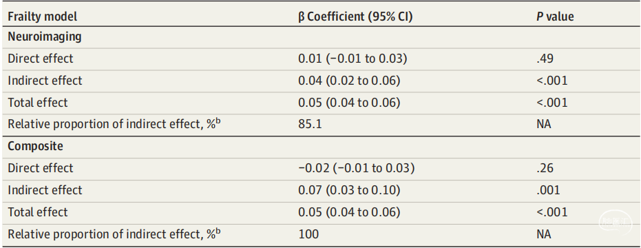 在模型2中,分析显示年龄对90天结局的总体影响为:每增加10岁,平均mRS分数会上升0.5个百分点。年龄的直接效应在统计上不显著,每增加10岁,平均mRS分数的变化仅为-0.02;然而年龄的间接效应则更为显著且更大:每增加10岁,平均mRS分数增加0.7。这意味着,脑衰弱神经影像学指标的影响完全占据了年龄对90天结局影响的全部(图2B和表2)。