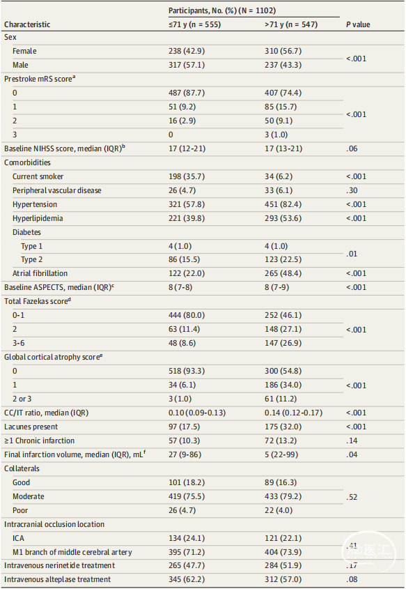 在ESCAPE-NA1试验中,共1105名患者被纳入研究,其中1102人(99.7%)的基线非增强CT(NCCT)可用于评估脑衰弱。患者的中位年龄为71岁,548人(49.7%)为女性,549人(49.8%)接受了IV nerinetide治疗。与年龄≤71岁的患者相比,年龄>71岁的患者中女性比例更高(310/547 [56.7%] vs 238/555 [42.9%] ;P<0.001),不吸烟者比例更高(34/547 [6.2%] vs 198/555 [35.7%] ;P<0.001),Fazekas评分为2,3-6分者更高,最终梗死体积更小。年龄较大的患者组在ASPECTS评分、梗死部位和侧支循环等方面与年龄较小的患者组相似。在年龄较小的组中,有487人(87.7%)的术前mRS评分为0(表1)。年龄与90天的结局呈正相关,其中通过脑衰弱神经影像的中介作用占总效应的85.1%。