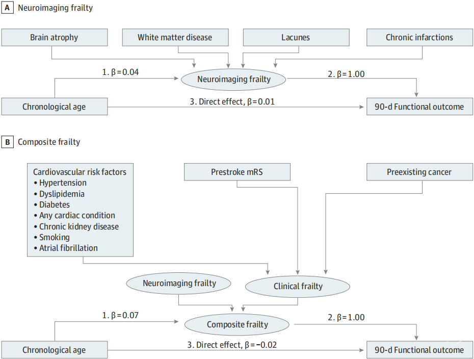 本研究在2017年3月1日至2019年8月12日期间,在8个国家的48家急诊医院中招募患者(涵盖加拿大、美国、德国、韩国、澳大利亚、爱尔兰、英国和瑞典)。研究对脑衰弱的标志物(包括亚皮质或皮质脑衰弱、脑室旁或深部白质疾变、小梗死和慢性梗死的数量)进行了回顾性评估。所有患者均接受了血管内治疗(EVT),并随机分配接受神经保护剂NA-1(Nerinetide)和阿替普酶治疗及最佳医疗管理。主要研究结果是探讨年龄通过脑衰弱神经影像对90天预后结果的中介影响。