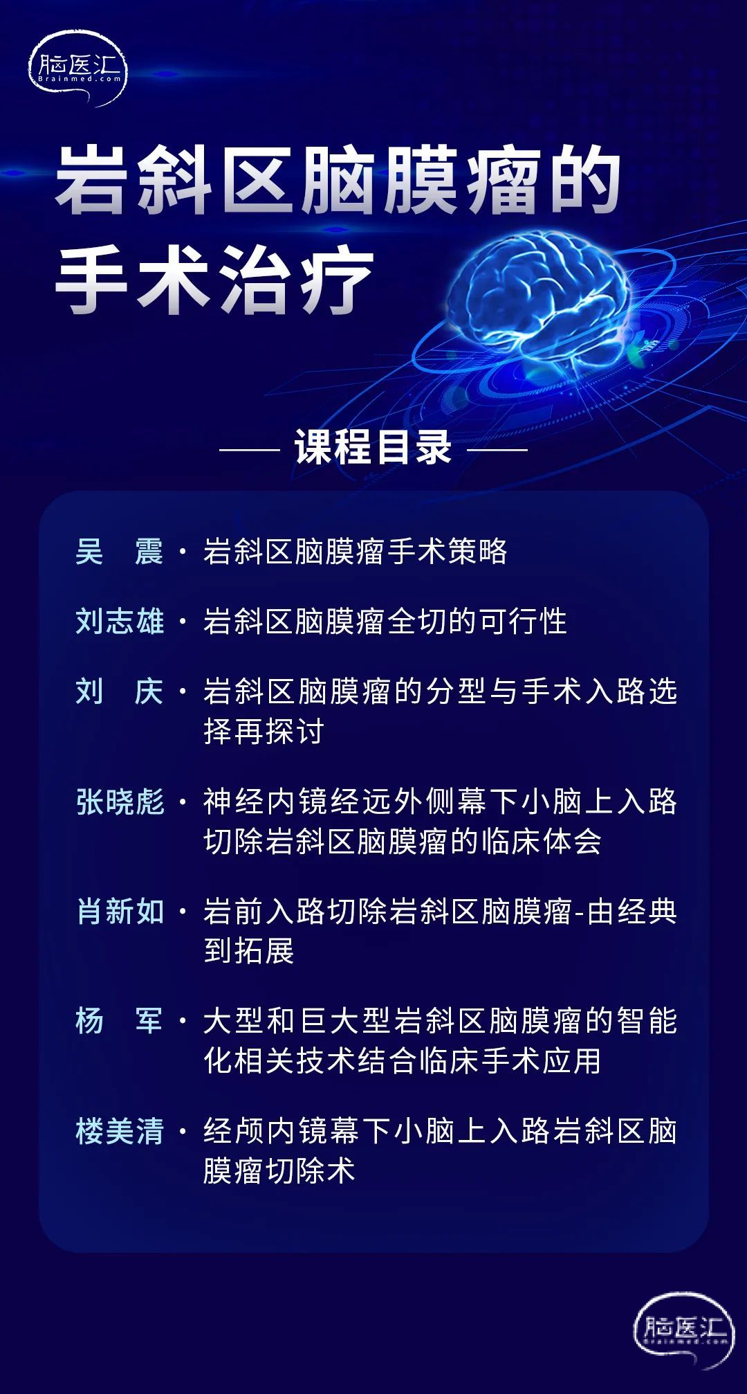 岩斜区脑膜瘤基底位于后颅窝上2/3斜坡和内听道以内岩斜裂;跨岩尖向中颅窝发展,侵犯海绵窦。位置深、神经血管结构复杂,手术难度大,全切率低,死残率高,是最富挑战的领域之一。