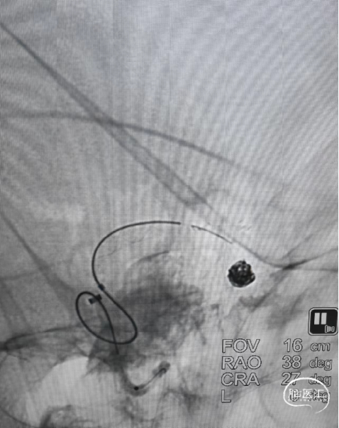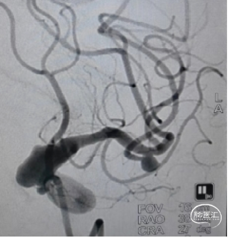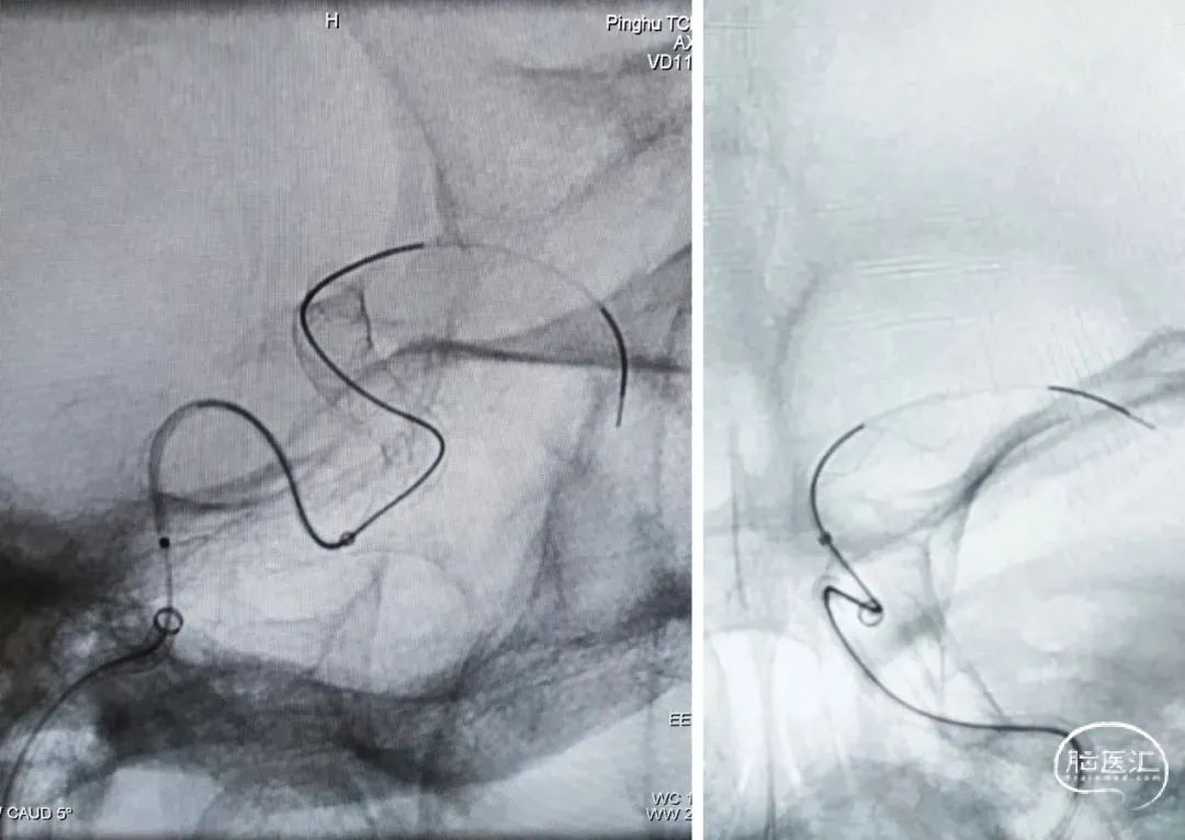随即进行颈内动脉末端夹层动脉瘤的治疗,工作位置角度下,交换XT-27支架微导管,通过辅助支架至大脑中远端。