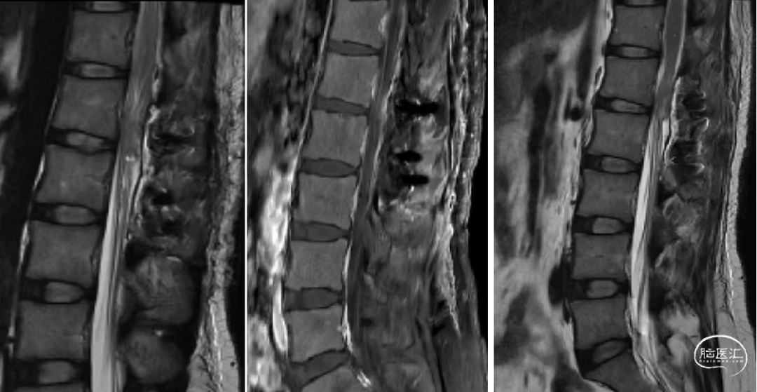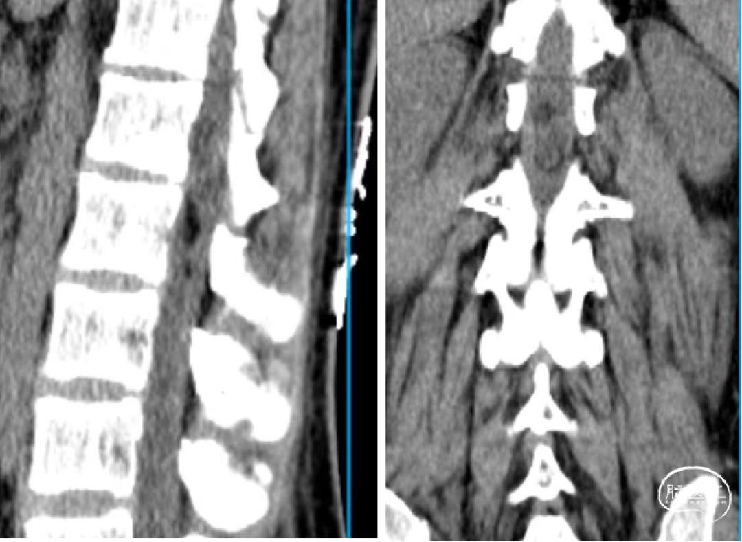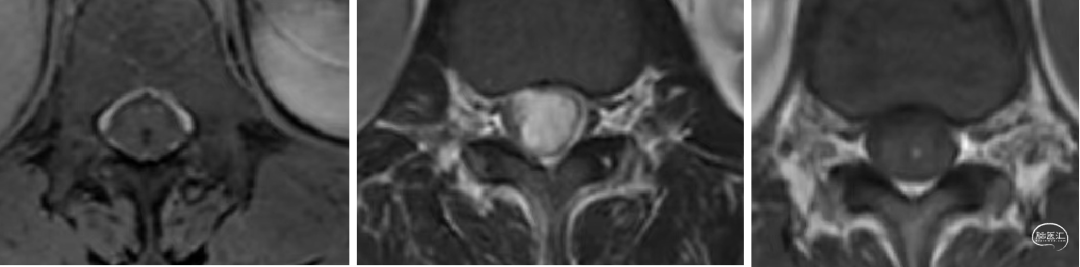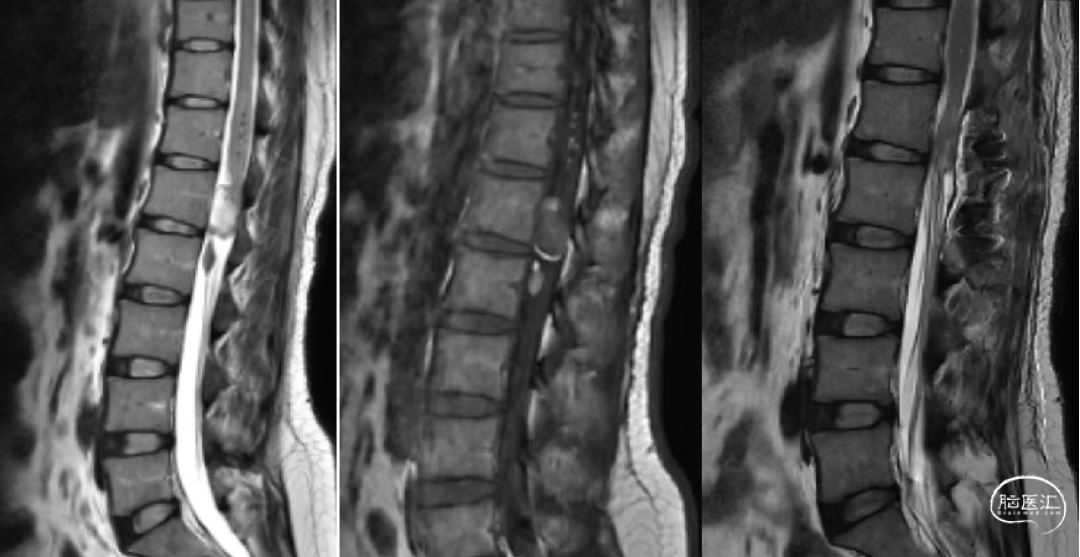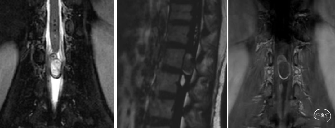 辅助检查:腰椎CT和MR示:L1-2椎管内硬膜下见一软组织信号结节,大小约24mm×12mm×10mm,T1W1低信号,T2W1稍高信号,增强扫描明显强化,但欠均匀,临近脊髓受压改变等。