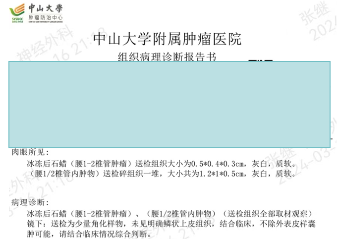 陈卓鹏医师在内镜和显微镜中的协助为手术的顺利完成提供了帮助。肿瘤挤压脊髓圆锥,与其及马尾神经根粘连紧密,显微下切除视野直视下肿瘤,内镜辅助下予以切除肿瘤两端,马尾神经根完好保留,内镜下操作直视外部分肿瘤,减少对神经根的牵拉,降低了术后患者不适发生的机率。术后患者腰部下疼痛及肢体活动障碍症状明显改善。