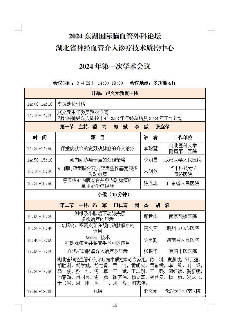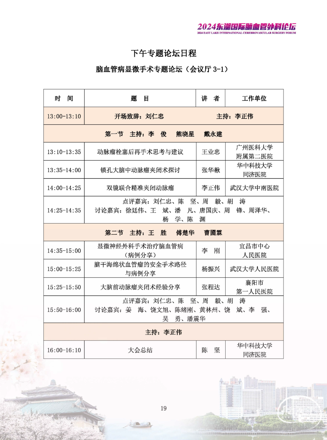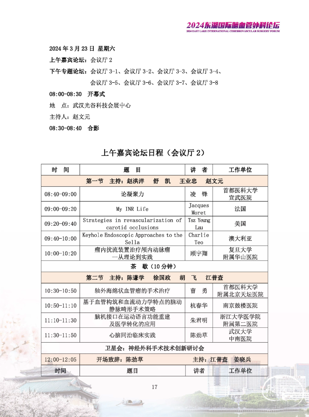 2024年3月这个樱花盛开的季节,我们将迎来“东湖国际脑血管外科论坛”的第九次盛会。届时来自国内外的脑血管专家们将再次齐聚一堂,可谓是星河璀璨、大咖云集。籍此契机,我们将从更高的角度、更广的视野,再次关注和审视国内外脑血管病的诊疗现状。本届大会以脑血管病为核心,将神经外科、神经内科、神经重症、神经康复、神经影像、神经护理等多学科交融在一起,也邀请了国际脑血管外科专家前来做专题报告,相信这场高水平的学术盛宴一定会促进中国脑血管疾病诊疗水平的提高并与国际接轨。