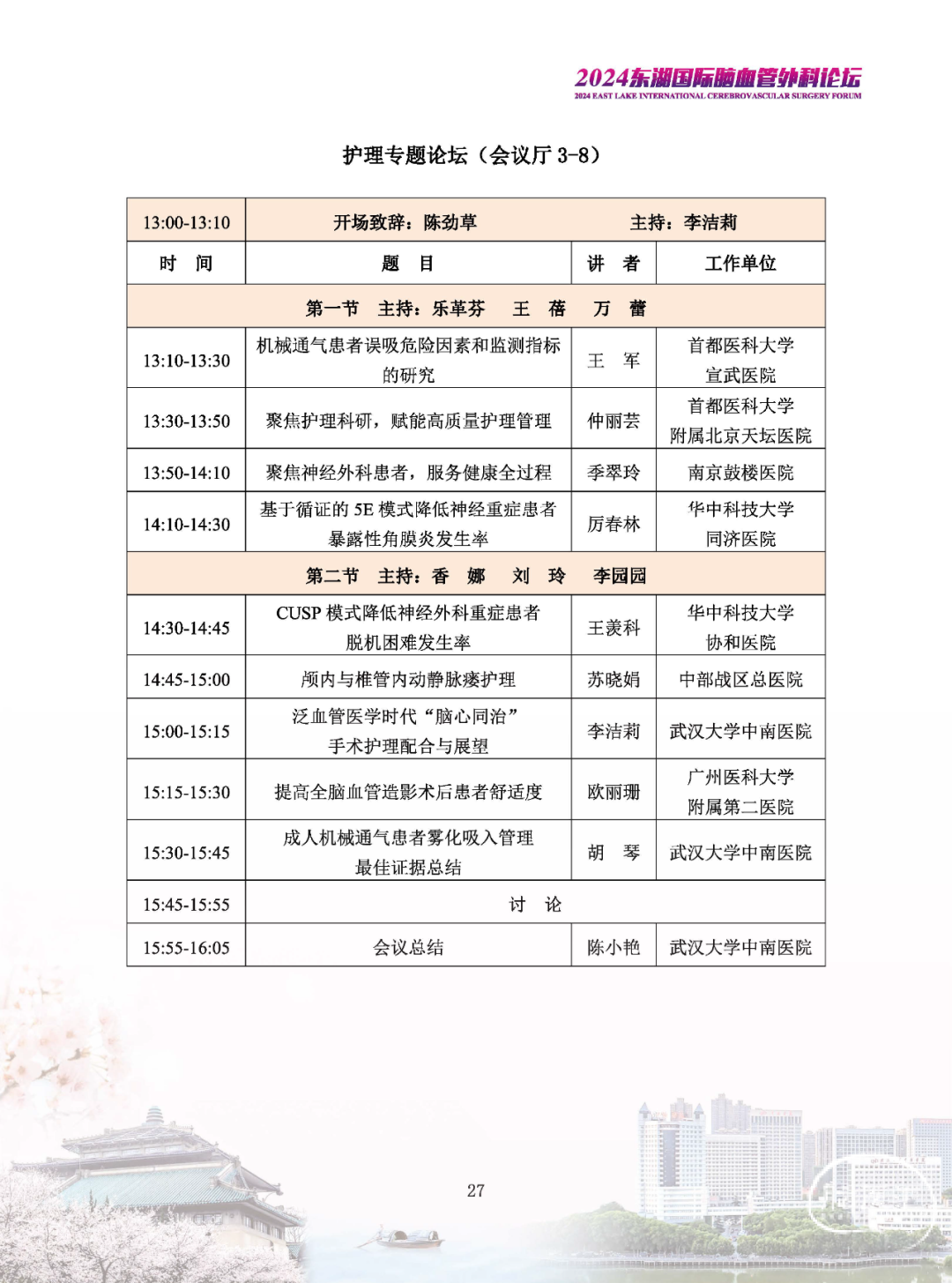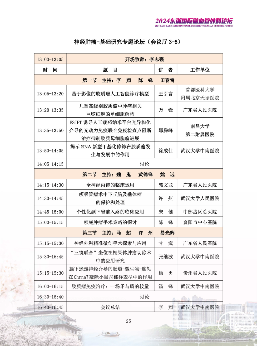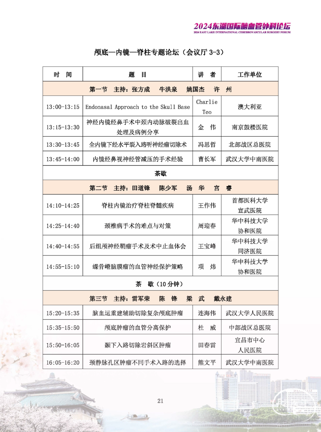 2024年3月这个樱花盛开的季节,我们将迎来“东湖国际脑血管外科论坛”的第九次盛会。届时来自国内外的脑血管专家们将再次齐聚一堂,可谓是星河璀璨、大咖云集。籍此契机,我们将从更高的角度、更广的视野,再次关注和审视国内外脑血管病的诊疗现状。本届大会以脑血管病为核心,将神经外科、神经内科、神经重症、神经康复、神经影像、神经护理等多学科交融在一起,也邀请了国际脑血管外科专家前来做专题报告,相信这场高水平的学术盛宴一定会促进中国脑血管疾病诊疗水平的提高并与国际接轨。