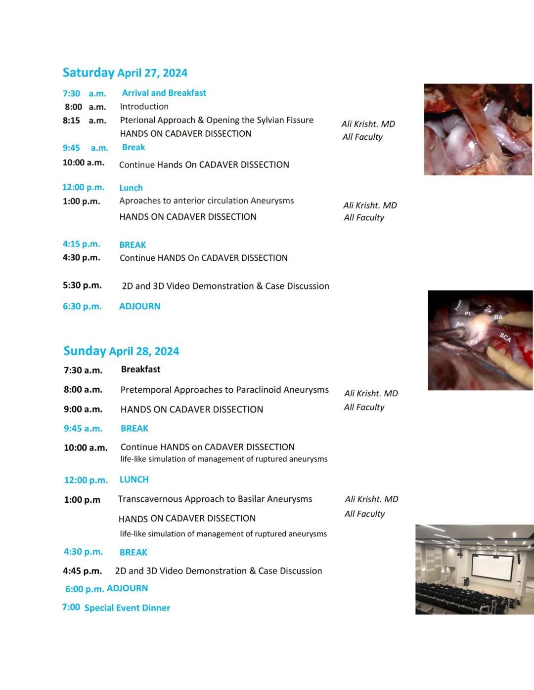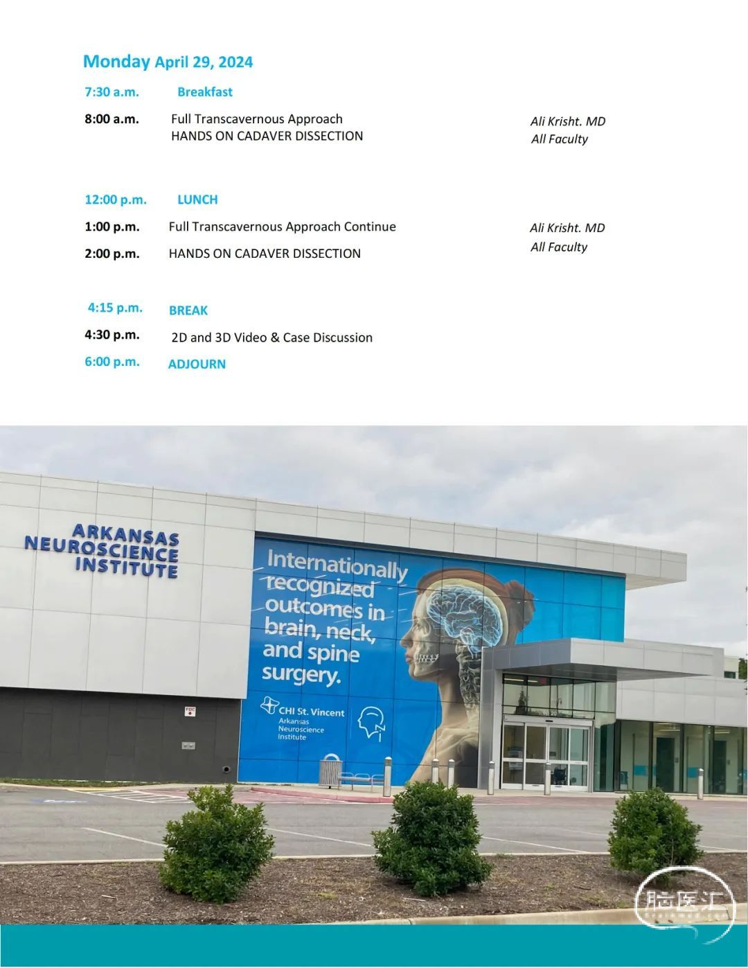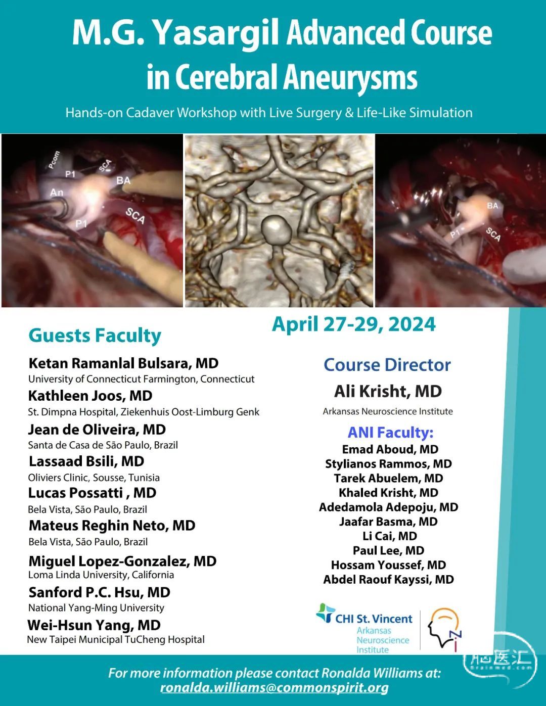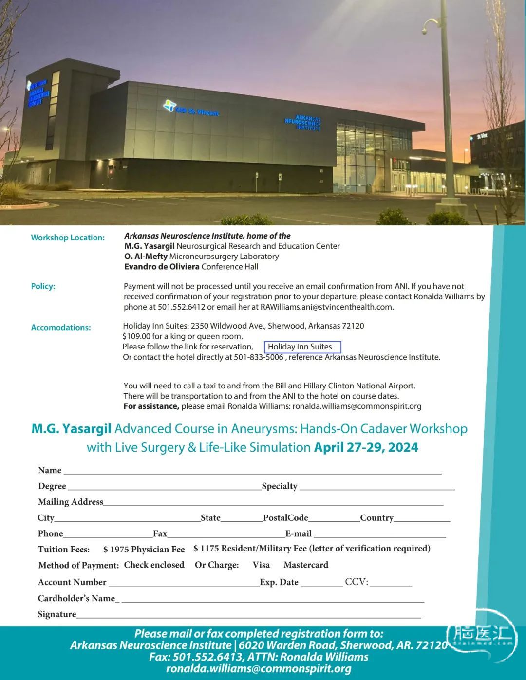 M.G. Yasargil动脉瘤高级课程:尸头解剖实践课程日期:2024年4月27-29日(美国时间)地点:阿肯色州神经外科研究院课程内容:现场尸头手术和逼真模拟学费:- 主治医生及以上学费:1975美元- 住院医师或医学生学费(需提供证明信):1175美元付款方式:支票或转账(Visa、万事达卡)付款信息包括账号、过期日期和CCV。请将填妥的报名表(见附件)邮寄或传真至:Arkansas Neuroscience Institute地址:6020 Warden Road, Sherwood, AR.72120传真:501.552.6413ATTN:Ronalda Williams电子邮件:ronalda.williams@commonspirit.org在您收到阿肯色神经科学研究所确认电子邮件之前,我们不会处理您的付款。如果您在出发前未收到注册确认,请通过以下方式联系Ronalda Williams:电话:501.552.6412电子邮件:RAWilliams.ani@stvincenthealth.com住宿信息:假日酒店套房地址:2350 Wildwood Ave., Sherwood, Arkansas 72120房型和价格:- 大床房:109.00 美元/晚请扫描/点击下方二维码或直接拨打电话预订:501-833-5006,请注明 "阿肯色神经科学研究所"。交通服务:在课程期间,将提供往返于阿肯色州神经科学研究所和假日酒店套房之间的交通服务。如需帮助,请发送电子邮件至:ronalda.williams@commonspirit.org附:声明:脑医汇旗下神外资讯、神介资讯、神内资讯、脑医咨询、Ai Brain 所发表内容之知识产权为脑医汇及主办方、原作者等相关权利人所有。投稿邮箱:NAOYIHUI@163.com 未经许可,禁止进行转载、摘编、复制、裁切、录制等。经许可授权使用,亦须注明来源。欢迎转发、分享。