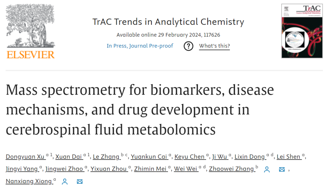 近日,武汉大学中南医院神经外科熊南翔教授团队在《Trends in Analytical Chemistry》(中科院1区top期刊,IF:14.9)上发表题为“Mass spectrometry for biomarkers, disease mechanisms, and drug development in cerebrospinal fluid metabolomics”的论文。武汉大学第二临床学院的8年制研究生徐东源为第一作者,武汉大学中南医院神经外科戴璇博士为共同第一作者,武汉大学中南医院神经外科熊南翔教授和武汉纺织大学生物工程与健康学院张兆威教授为共同通讯作者。