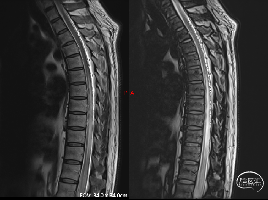 现病史摘要:缘于5月余前患者无明显诱因逐渐出现双下肢无力,走路时酸胀感,易疲劳,不能长距离行走,右下肢明显,晨轻暮重,无疼痛、肌肉萎缩和大小便异常,完善颈胸部MRI显示胸髓表面多发迂曲血管影,胸5-12椎体水平髓内异常信号。