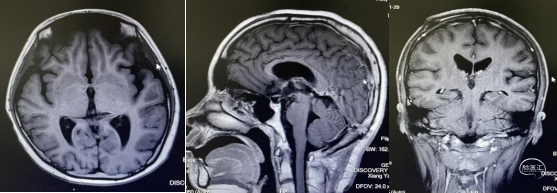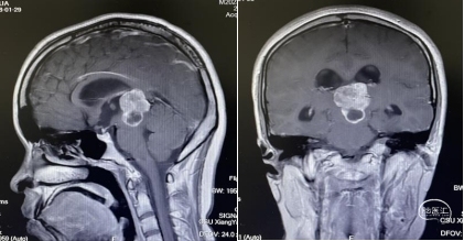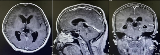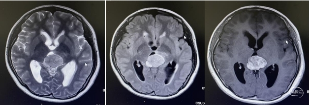 头部磁共振:松果体区可见一稍长-长T1、稍长-长T2信号灶,内可见小片状短丁1信号,增强后实性成分明显不均匀强化,大小约30mmx24mmx33mm,病灶部分伸入第三脑室,第三脑室扩张,双侧丘脑受压移位,中脑导水管,以慕上脑室系统积水扩张,双侧脑室旁可见线样FLAIR高信号。左侧丘脑,左侧脑桥及桥臂可见小片状长T1长T2信号,FLAIR呈高信号。