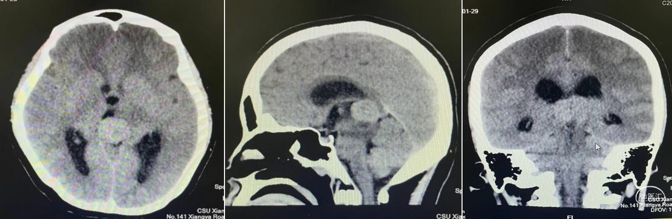 头部CT平扫:松果体区可见软组织肿块灶,大小约为27mmx23mm,平扫CT值为36HU。边缘可见斑点状钙化灶,邻近脑实质可见片状水肿低密度灶,慕上脑室积水扩张,双侧侧脑室旁可见对称性低密度灶。