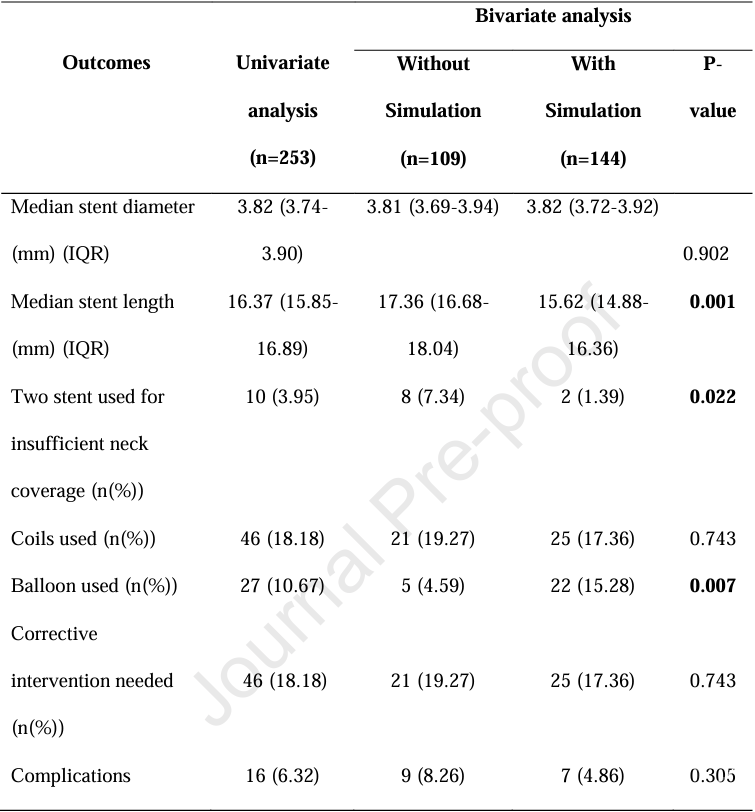 其中144名(占56.9%)使用了Sim&Size™模拟,其余109名(占43.1%)没有使用。使用Sim&Size™模拟的患者中,支架的平均长度较短(15.62mm vs 17.36mm,p值=0.001)。此外,这些患者较少使用一个以上的支架(1.4% vs 7.3%,p值=0.022),而进行球囊扩张的患者比例则更高(15.3% vs 4.6%,p值=0.007)。其余分析的变量在两组之间没有显著差异(p值>0.05)(表2)。