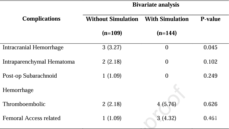 4例患者发生了与股动脉入路相关的出血并发症。其中3例在使用Sim&Size™模拟的组别中,1例在未使用模拟的组别中。在为期30天的随访期间,没有观察到由并发症导致的神经系统后遗症。