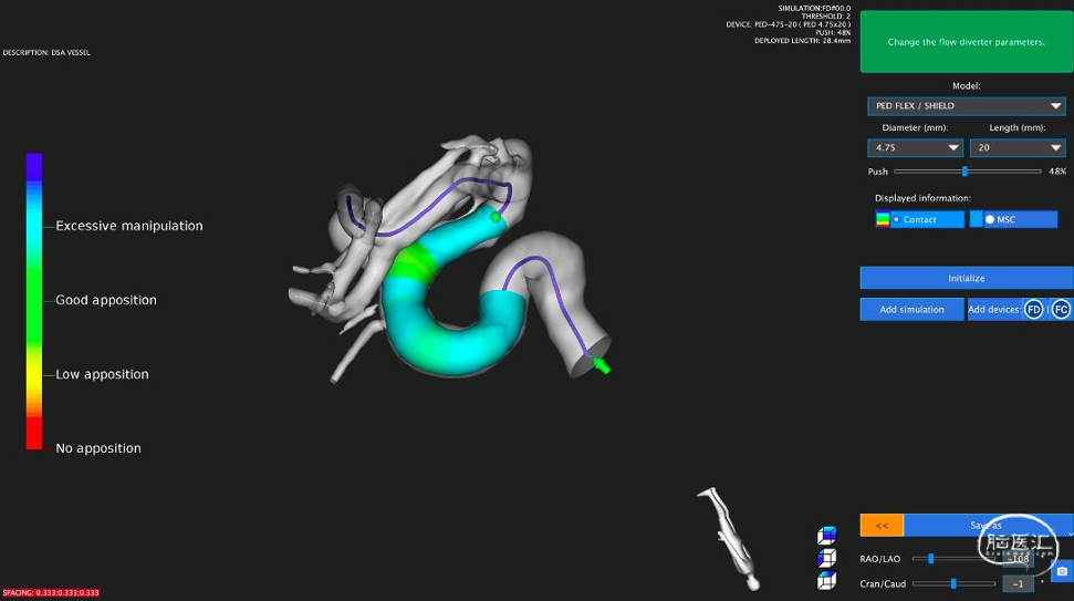 图1. 一名颈内动脉眼段动脉瘤患者的Sim&Size™模拟图像,该患者接受了Pipeline Flex Shield治疗,支架直径为4.75毫米,长度为20毫米。
