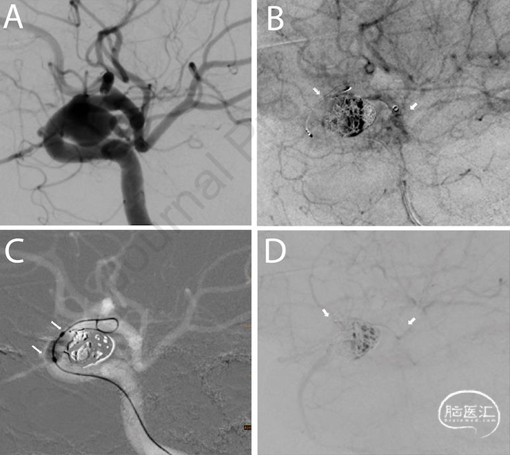 图2. A. 显示右侧颈内动脉眼段囊状动脉瘤的血管造影图,大小为6.6毫米x8.0毫米。B. 术中DSA图像显示Pipeline shield embolization支架的放置,覆盖了动脉瘤颈部(箭头指示)。C. 显示在右侧颈内动脉海绵窦段至M1段进行的球囊扩张成形术(箭头指示)。D. 球囊扩张成形术后DSA图像显示Pipeline shield embolization支架的成功放置,瘤颈部(箭头指示)以及远端血管和支架的通畅性。