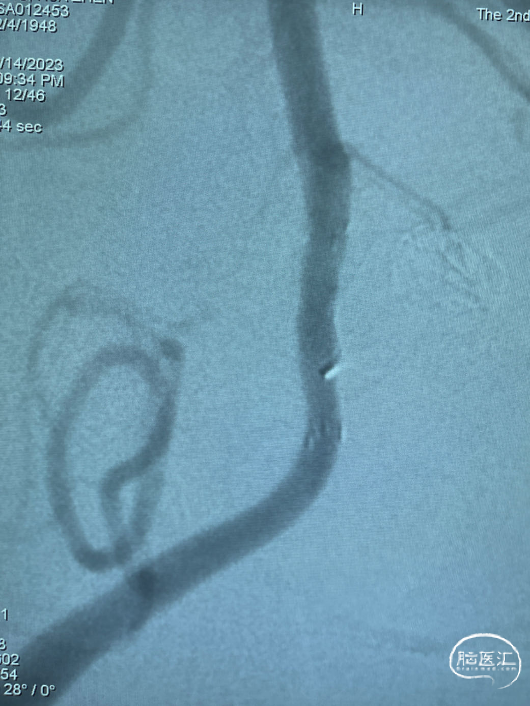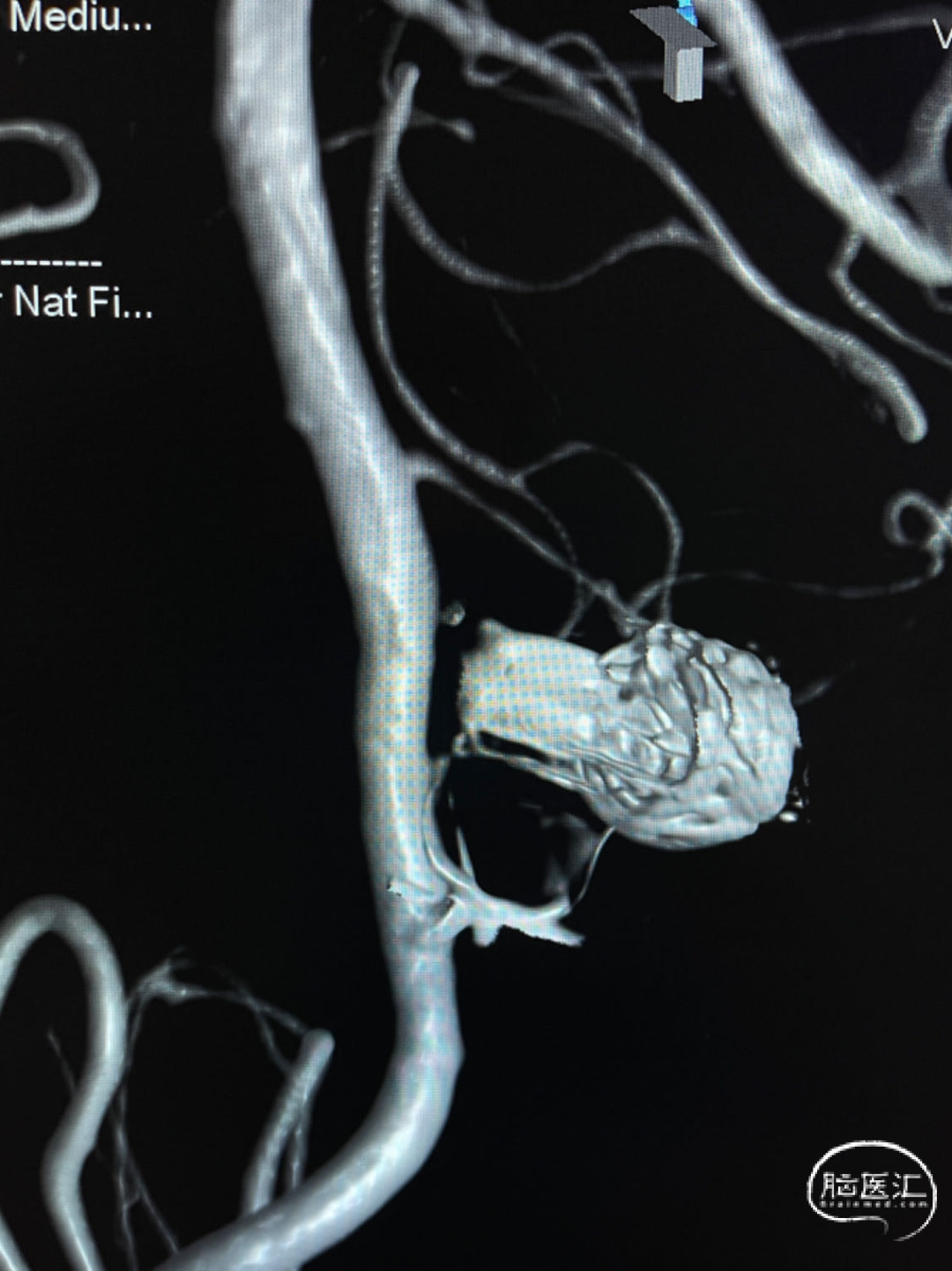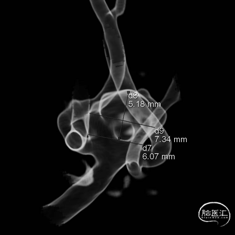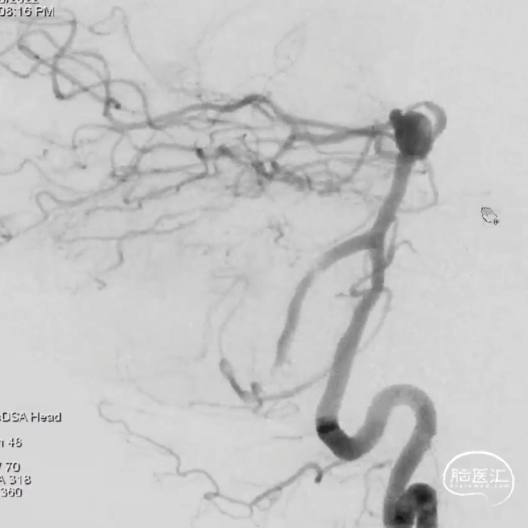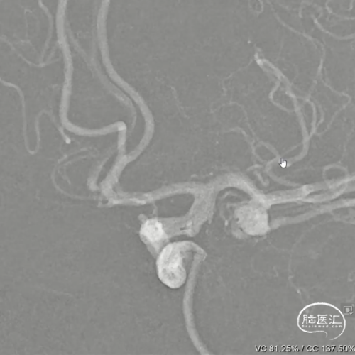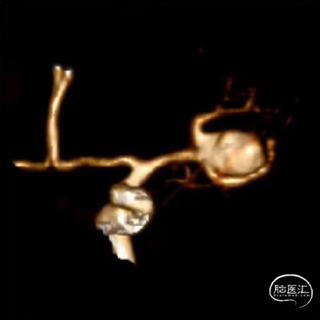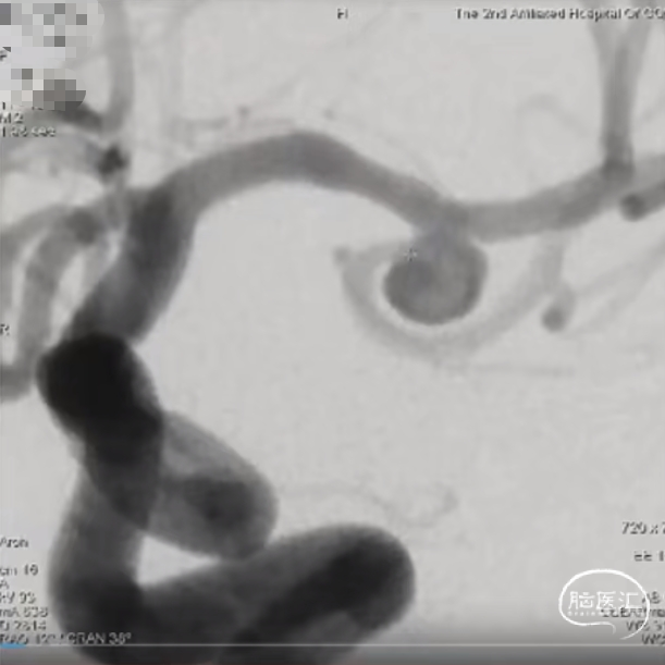 此为左侧大脑中动脉瘤,近端血管极为迂曲,瘤体有突出的子囊,动脉瘤与载瘤动脉有一定夹角,动脉瘤呈上窄下宽形状,M2段下干从瘤颈近端发出。