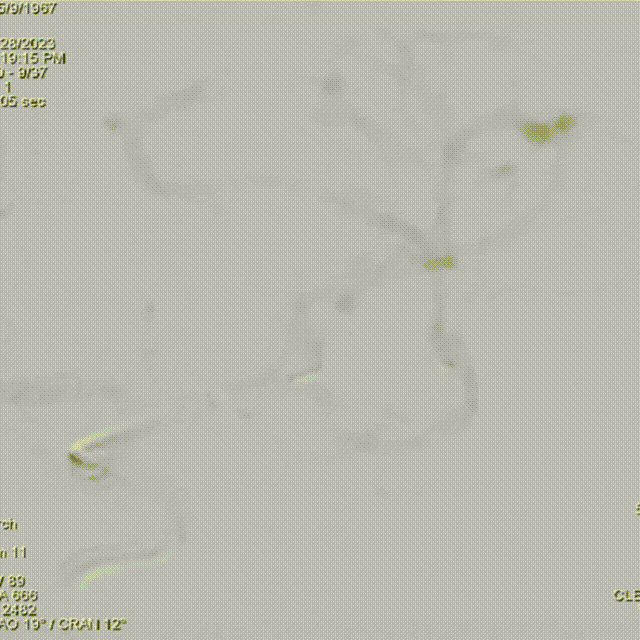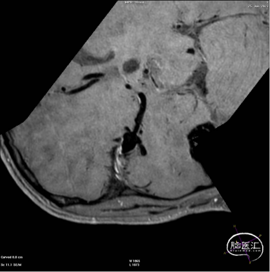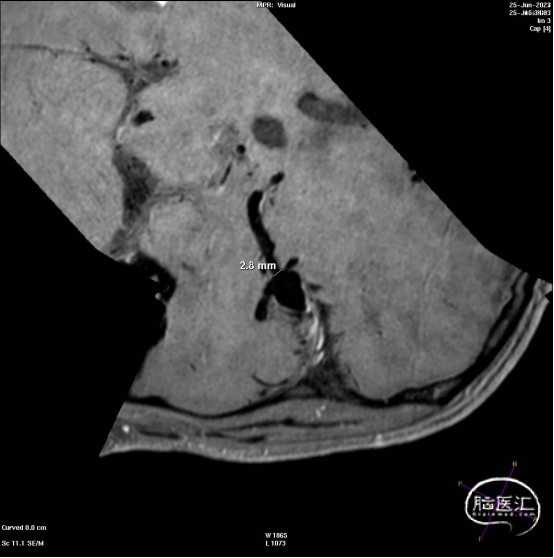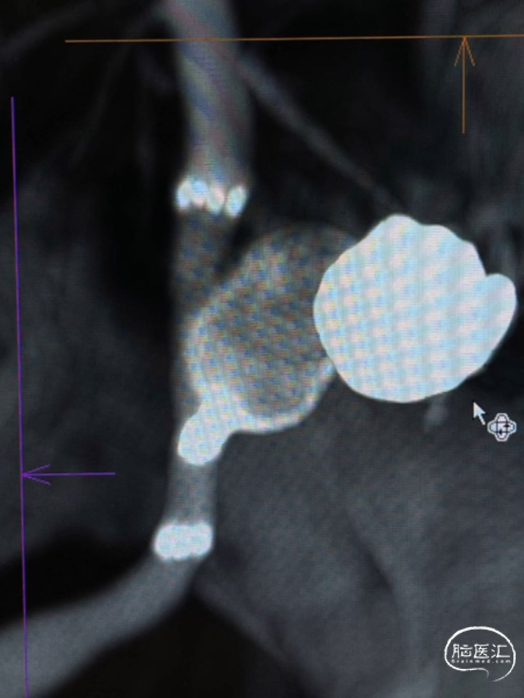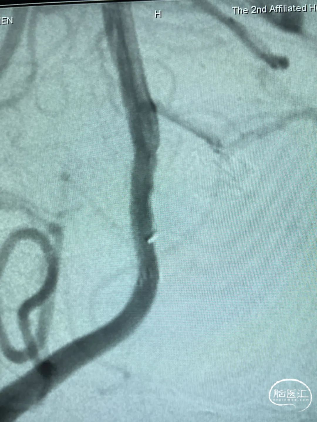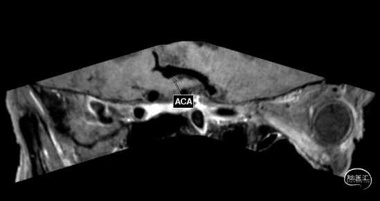 此为左侧大脑中动脉瘤,近端血管极为迂曲,瘤体有突出的子囊,动脉瘤与载瘤动脉有一定夹角,动脉瘤呈上窄下宽形状,M2段下干从瘤颈近端发出。