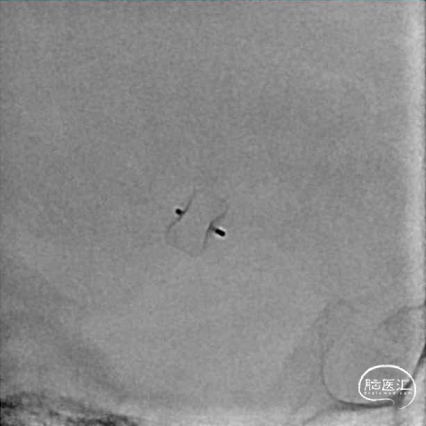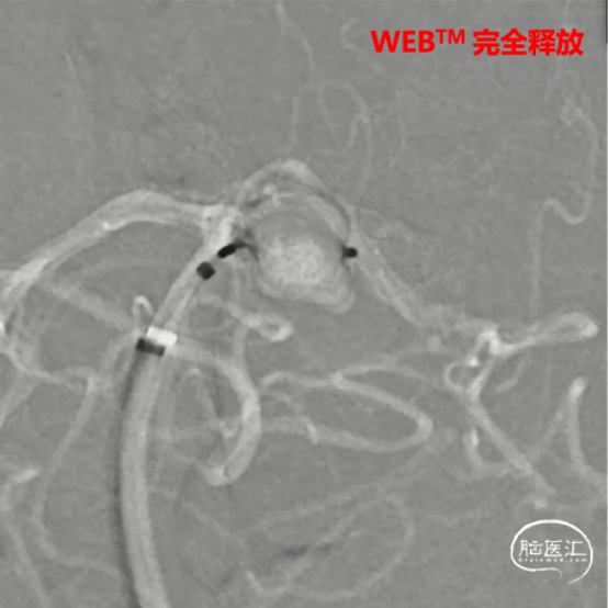 WEB™经由VIA™微导管送入动脉瘤瘤腔并完全释放。术后即刻造影显示WEB™尺寸合适,贴壁良好,分支等血流通畅。解脱后再次造影,可见动脉瘤瘤腔内有明显造影剂滞留。