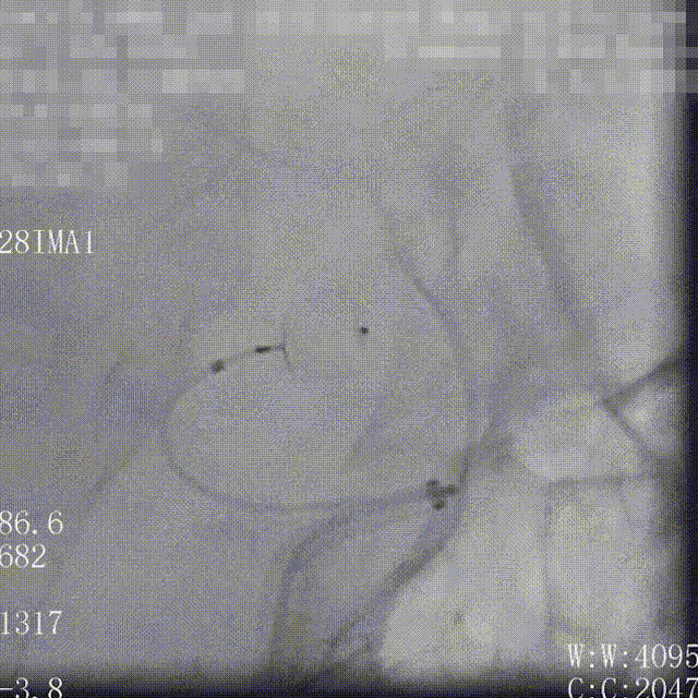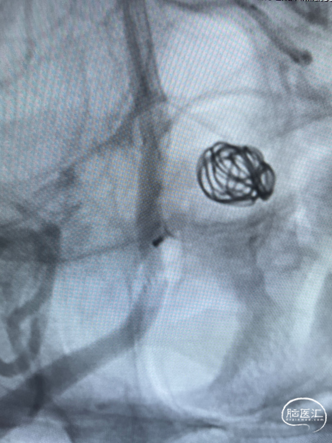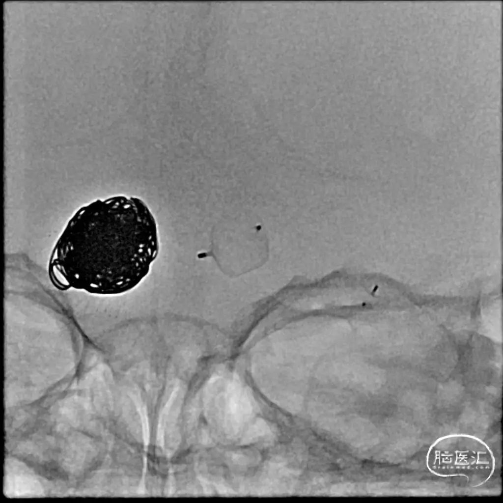 Headway 17微导管塑形后置入动脉瘤瘤体内,半释放18mm*44cm complex弹簧圈成篮,半释放3.5mm*20mm LVIS支架保护瘤颈后完全释放18mm*44cm complex弹簧圈成篮,后依次释放6枚弹簧圈栓塞动脉瘤,最后一枚弹簧圈释放完成后造影,后交通动脉瘤少量造影剂进入,完全释放支架,右侧后交通动脉瘤瘤体内极少量造影剂进入,子囊不显影,Raymond分级3级,同时造影见各主干级分支血管显影良好,遂退出系统。