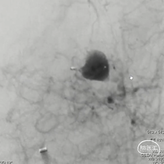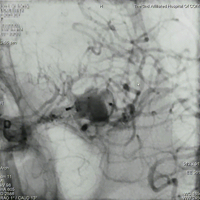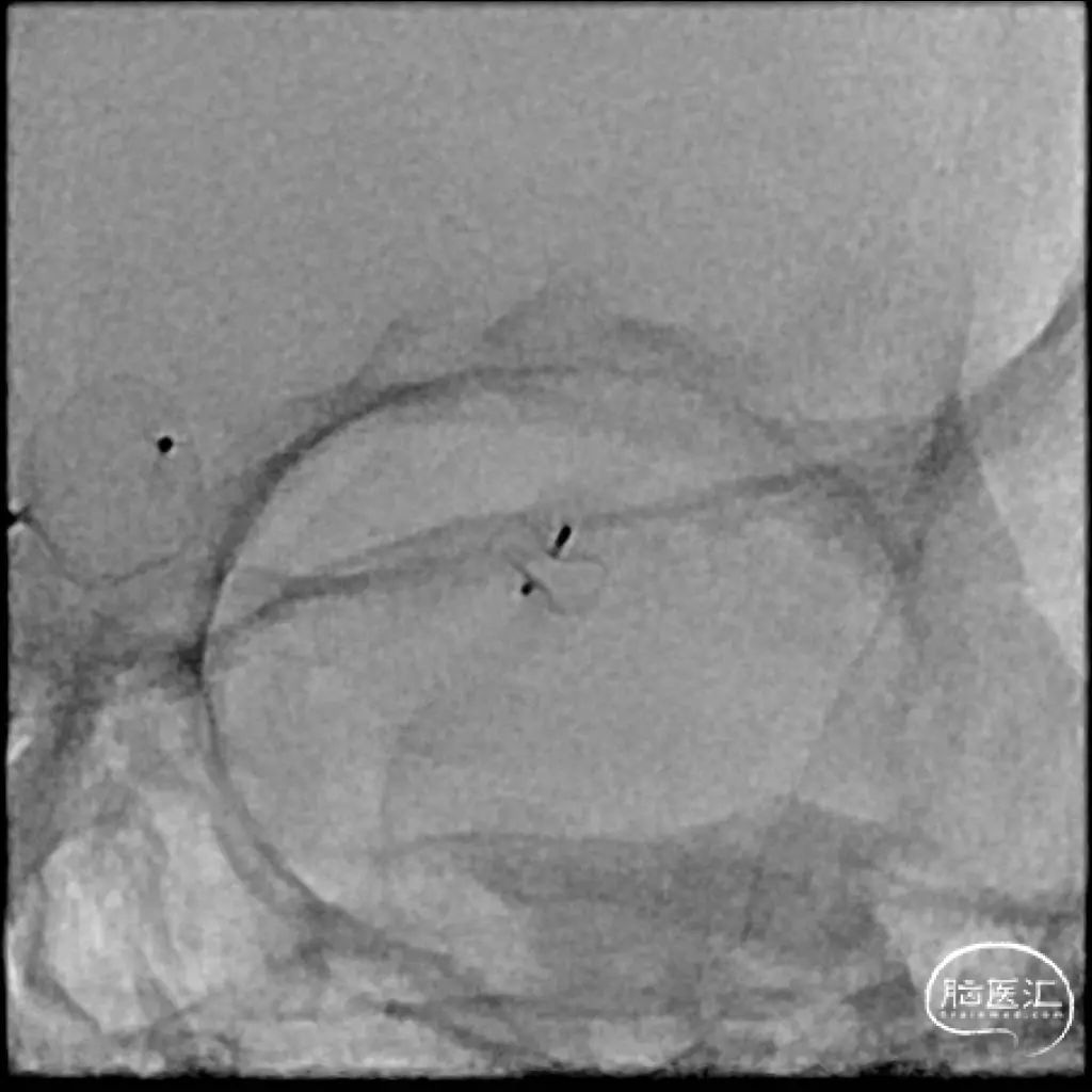 解脱后,再次造影和Dyna-CT评估,可见动脉瘤瘤腔内有明显造影剂滞留,分支血管血流正常。