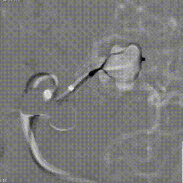动脉瘤平均宽度5.41mm, 最小高度为3.71mm,瘤颈约为4.94mm,使用WEB™ SL 6*3mm瘤内扰流装置进行栓塞治疗。