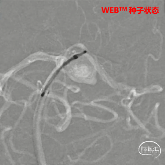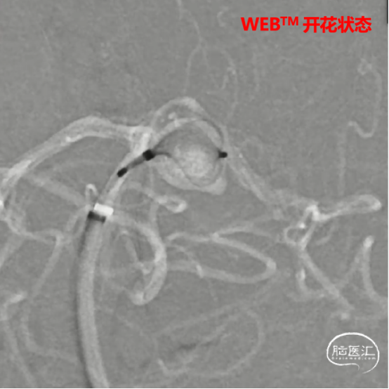 WEB™经由VIA™微导管缓慢推送至微导管头端。缓慢推出WEB™从种子至萌芽状态,继续向瘤腔内远端缓慢推送WEB™至萌芽至开花间状态;将WEB™送至瘤顶,固定WEB™推送杆回撤VIA™,WEB™完全释放。