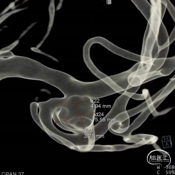 绝对瘤颈宽,右侧P1与瘤颈部分融合,容易疝出从而遮挡P1,应提前进行“分支保护”。