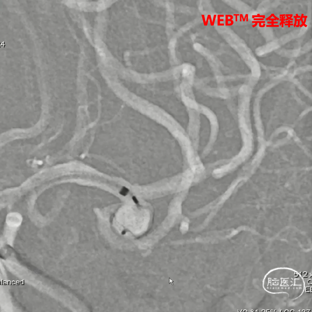 大脑中动脉瘤充分栓塞,瘤颈残留,WEB™充分栓塞。WEB™被压缩且位置偏转,分支血管有影响。