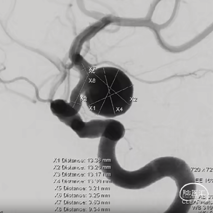 右侧后交通段动脉瘤,大小约13.36mm*13.26mm,瘤体上有子囊形成,床突段至后交通段血管稍狭窄,脉络膜前动脉距瘤颈部有一定距离。