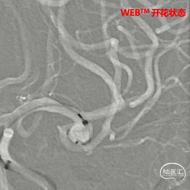 经造影可见WEB™尺寸合适,贴合瘤壁,覆盖瘤颈,且下支M2段分支及其他分支血管血流通畅。
