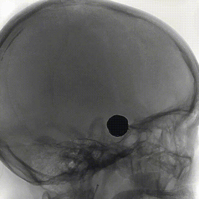 术中DSA造影:左侧颈内动脉3D造影,显示左侧颈内动脉海绵窦段动脉瘤,载瘤动脉远端直径3.36mm;近端直径4.20mm。