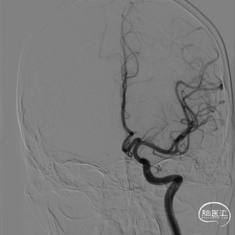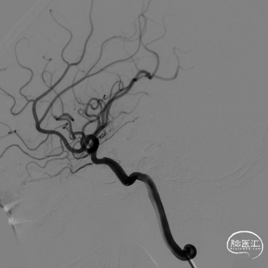 术中DSA造影:左侧颈内动脉正侧造影及压颈试验,前交通开放良好。