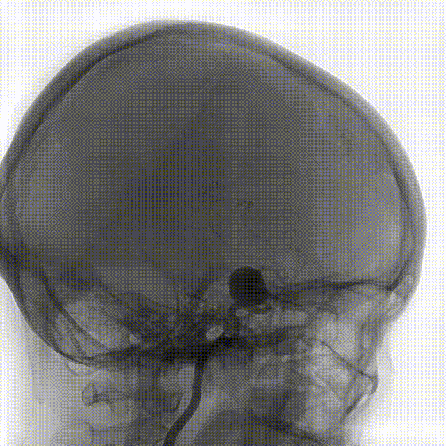完全释放FRED 4017血流导向密网支架辅助弹簧圈栓塞后,正、侧位及3D造影观察,载瘤动脉通畅、支架贴壁良好、动脉瘤内造影剂滞留。