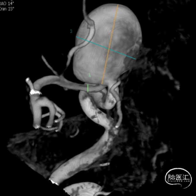 术中DSA造影:右侧颈内动脉3D造影提示:右侧颈内动脉床突旁大型动脉瘤,大小约为20.72×16.33mm,远端血管直径1.92mm,近端血管直径3.48mm。