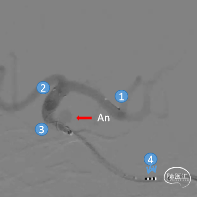 Headway™ 27 156cm微导管内输送FRED 4017血流导向密网支架,系统远端定位于预计着陆区以远2-3mm处,回撤微导管原位释放支架。释放至动脉瘤颈的迂曲处时,先回撤系统将微导管头端从大弯侧缓慢拉回至血管中央,观察到支架自膨打开后,轻推支架以保证支架贴壁。