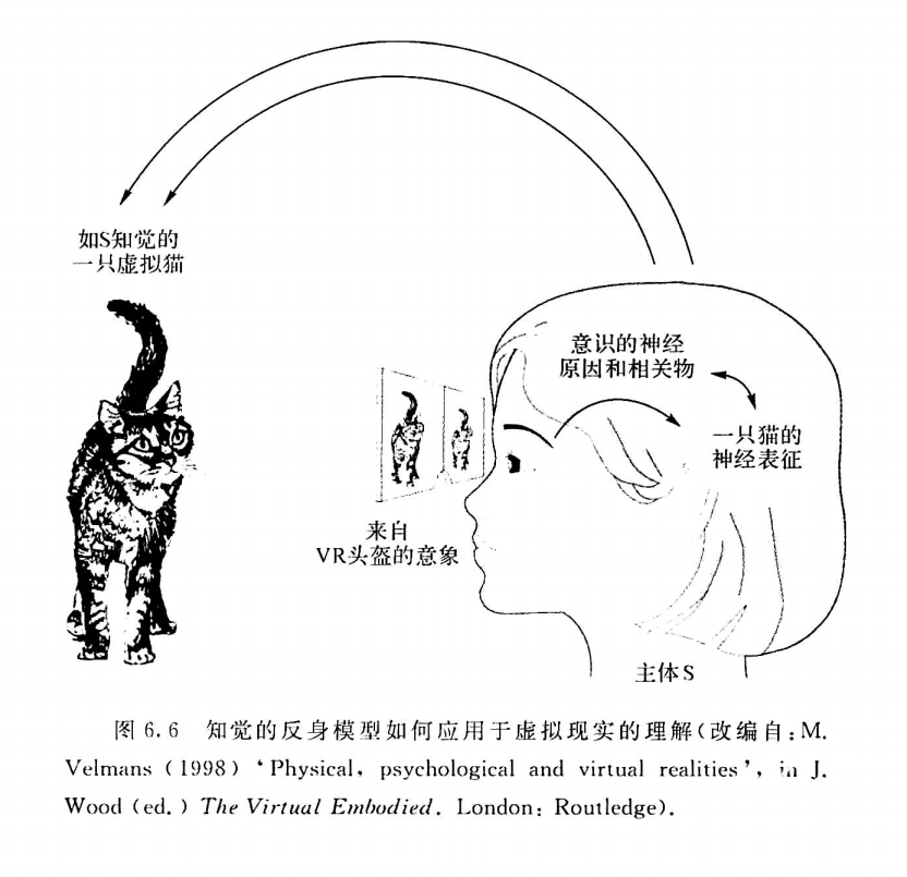 这些虚拟显象(appearance)很难纳人二元论或还原论对意识的理解,因为它们似乎不在“心智或脑中”——尽管仅仅是“似乎”(seeming)。但在反身模型中它们能很容易地被解释。以图6.6所示的方式,当来自VR头盔屏幕的视觉输入恰好与头和身体的动作相协调,它所提供的信息就与来自世界中实际对象的一样。心智/脑以正常方式建构这些信息的模型,并且基于这样的输入建构它通常建构的东西——一个定位并延展于三维空间中的知觉的、现象的世界。