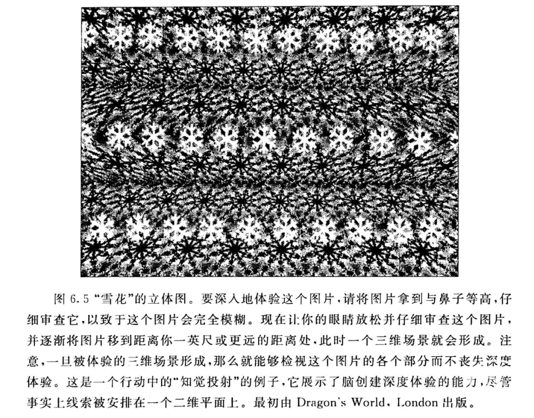 图6.5所展示的这类立体图制造了一个更有力的效果。如果一个人把眼睛聚焦在图片的后面(按照图标题中的指示),一个三维场景就会形成。一旦形成之后,一个人就可以观察图中的不同对象而不会破坏这种三维效果。正常情况下,视觉深度的构建是前意识地出现的,而且要存在建构所涉及的任何指示,加工都太快了。而立体图片的有趣之处就在于深度的完整体验是逐渐出现的,只有当一个人持续地观察图片后才会完全形成。在这种情况下,当建构发生时,(伴随着知觉投射的变化)人们就可以当场体验到一个三维视觉场景的构建的不同阶段。