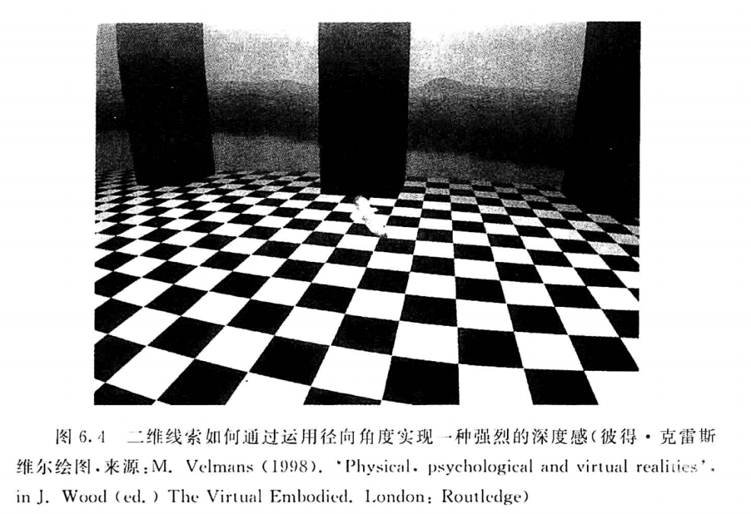 例如,众所周知,当一个物体退后时,它被知觉到的尺寸的缩小程度远小于它在视网膜上的光学投影的缩小程度,这支持了(“尺寸不变”的现象)。被知觉到的尺寸不仅随着被投射的视网膜图像的大小改变,还与目测距离(judgeddistance)有关——一个物体的目测距离本身就受到诸多因素的影响,诸如双眼像差、眼睛收敛、纹理梯度(textural gradients)、其他物体的干涉、运动视差等。的确,三维现象空间本身在某种程度上就可以表现为一种心智/脑的“建构物”(construct)。