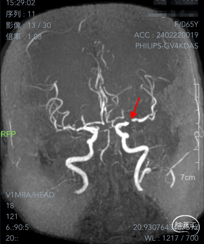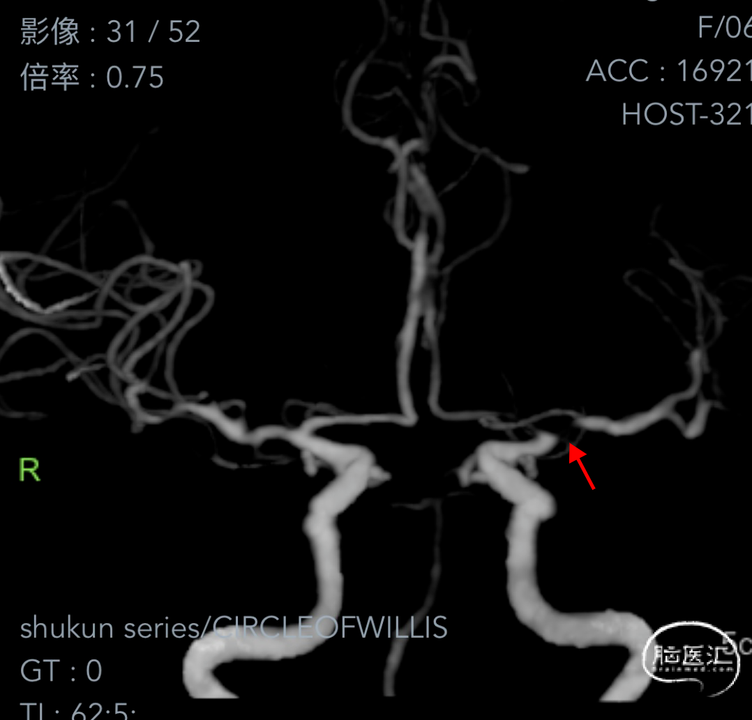 II型弓,左侧大脑中动脉M1段重度狭窄(几近闭塞)。