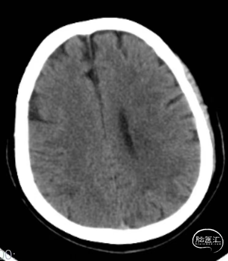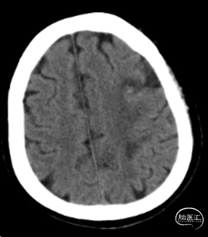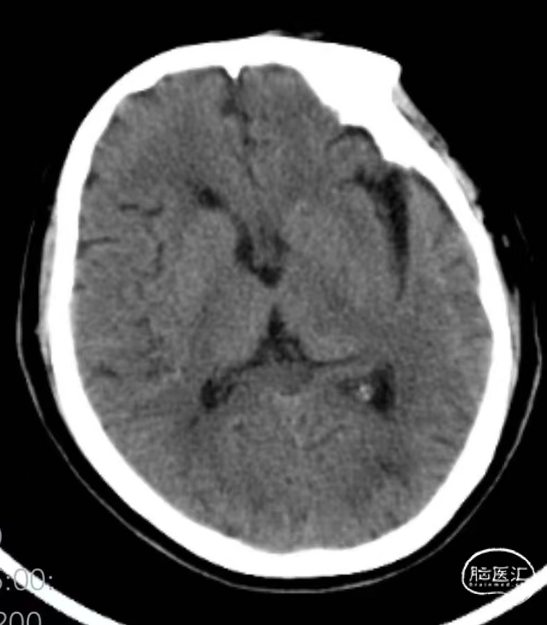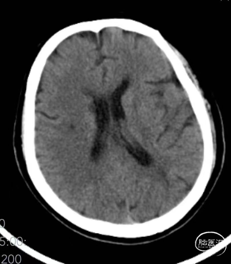 术后第二天复查头颅CT:无明显新发脑梗死。NIHSS评分7分(右上肢运动3分,右下肢运动2分,感觉1分,语言1分)。