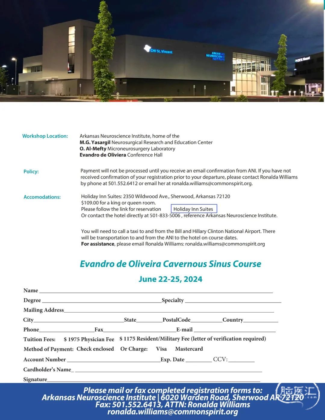 在您收到阿肯色神经科学研究所确认电子邮件之前,我们不会处理您的付款。如果您在出发前未收到注册确认,请通过以下方式联系Ronalda Williams: