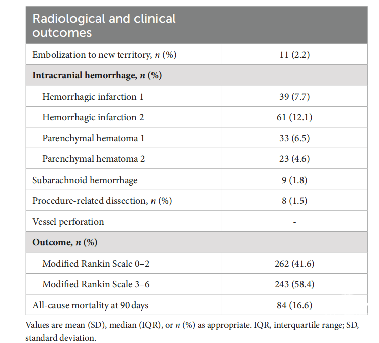 525例患者使用通桥蛟龙®取栓支架接受了取栓治疗。基线水平NIHSS评分为13分、ASPECTS评分为8分,患者年龄为68.6+11.7岁。穿刺-成功再通时间的中位时间为34分钟( [IQR]: 15-45)。mTICI2b-3级和mTICI2c-3级的一次再通率分别为48.2%、33.9%。最终,82.1%的患者获得了有效的再通(mTICI 2b-3)。在“一次再通”亚组中,良好的功能预后率(改良Rankin量表0-2)为51.8%,而在整个患者群体中为41.6%。发生远端逃逸的栓塞率为2.1/0.1%。23例(4.5%)患者有症状性颅内出血。