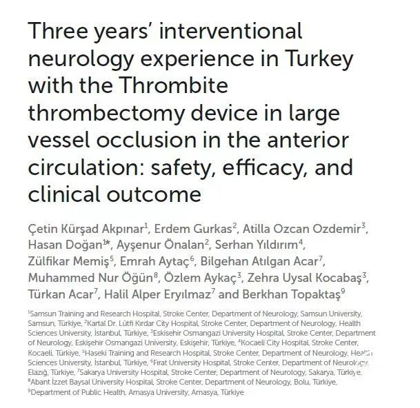 近期,土耳其University of Health Sciences的Erdem Gurkas教授及Samsun Training and Research Hospital的Çetin Kürşad Akpınar教授等研究者对从2020-2023年应用通桥蛟龙®(Thrombite™)取栓支架的病例做了回顾性研究分析,结果于2024年5月发表。