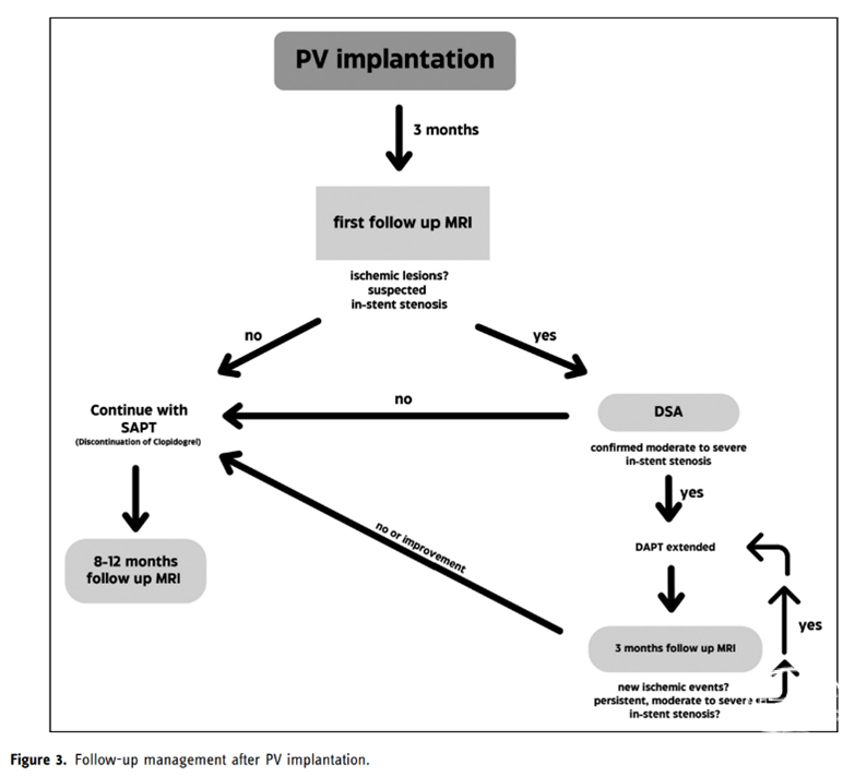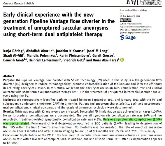 第三代Pipeline的名字叫“Shield”,对支架表面进行了抗栓处理,相当于一层“护盾”,理论上仅需要单抗即可,但由于伦理的问题,还没有大宗的随机对照研究确认。但是第四代Pipeline Vantage已经开始缩短双抗时间的研究(图6),并且取得了良好的结果(图7)。