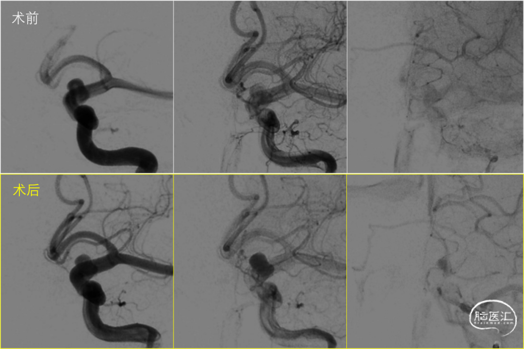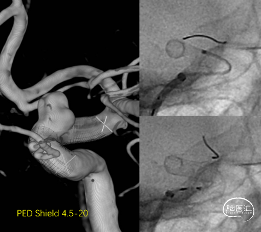 侧壁囊性动脉瘤,目前的主流方式是FD,本例动脉瘤直径较小,不必辅助弹簧圈。患者年龄较大,动脉硬化程度较重,围术期出现缺血并发症的风险略高,且抗栓治疗效果一般,AA抑制率91%,ADP抑制率45%;增强抗栓效果又恐引起其它脏器的出血,因此选择经过表面修饰,自带抗栓属性的新一代FD,Pipeline Shield应为上策。