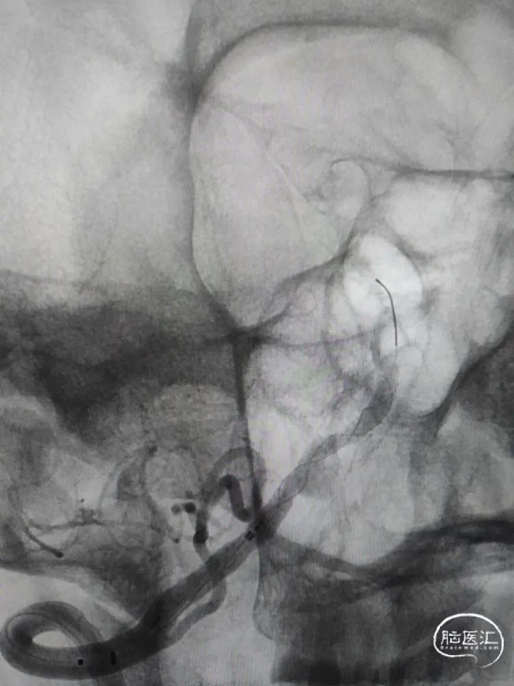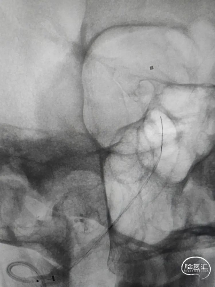 患者仰卧位,麻醉到位,常规腹股沟区消毒铺无菌巾,右股动脉穿刺置6F 90cm长鞘并完成全脑血管造影。