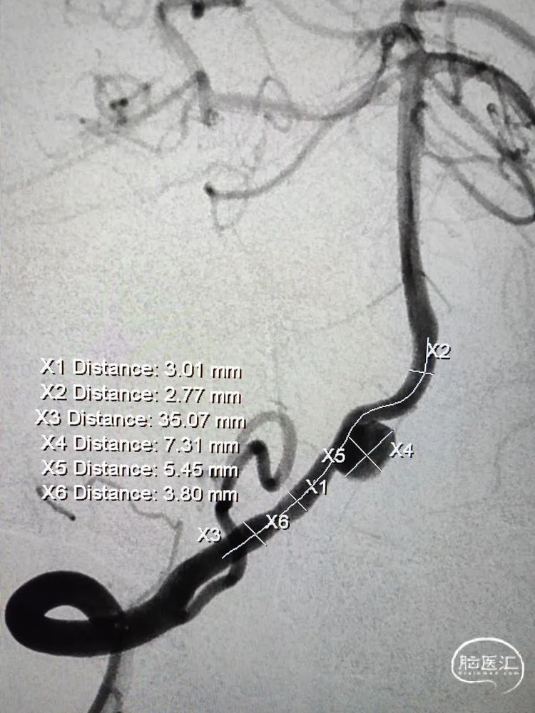 动脉瘤大小约5.45mm×7.31mm,动脉瘤远端椎动脉汇合前管径约2.77mm,动脉瘤近端V4段管径约3.80mm,V5段全长约35mm,对侧椎动脉正常。