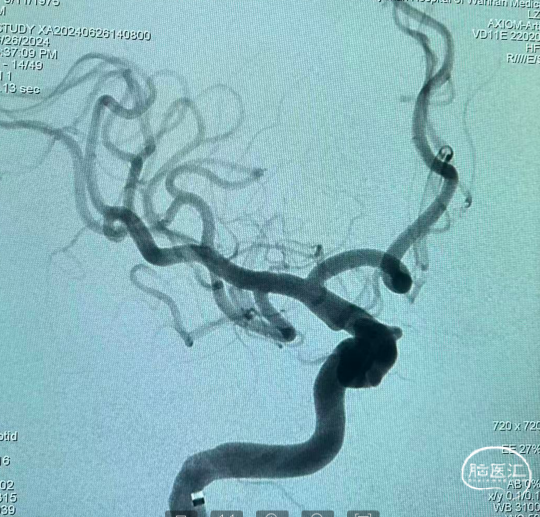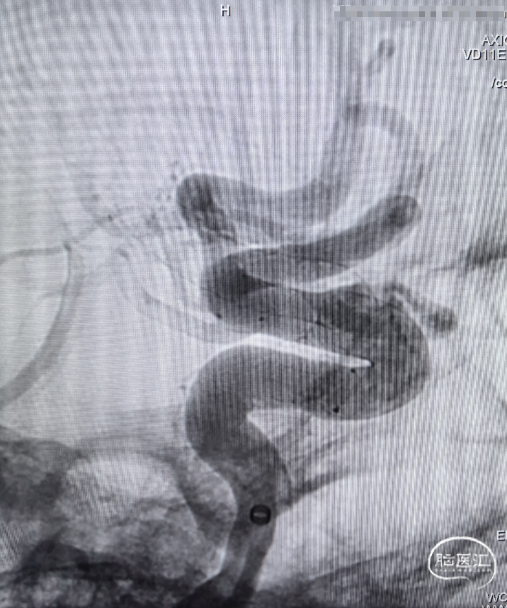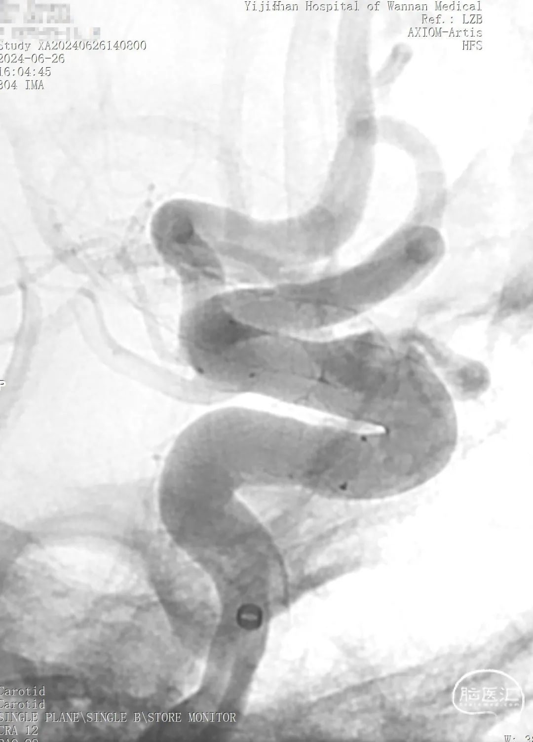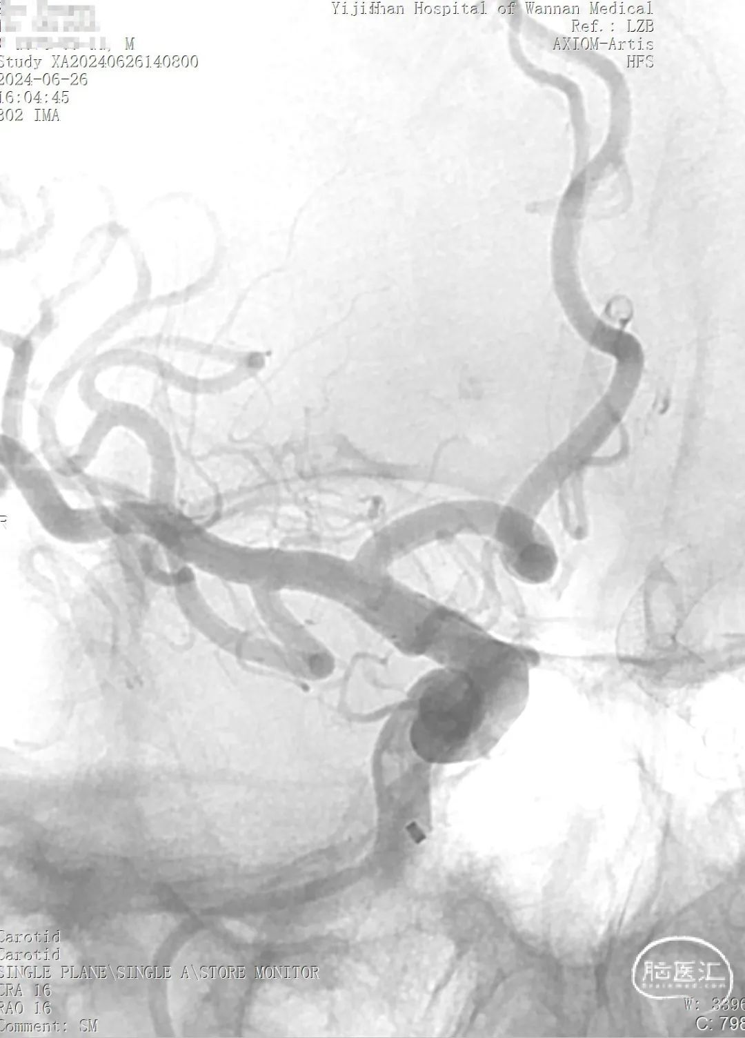 术后血管造影见动脉瘤仍有显影,瘤腔内造影剂滞留,支架展开,贴壁良好,载瘤血管血流通畅,手术顺利。