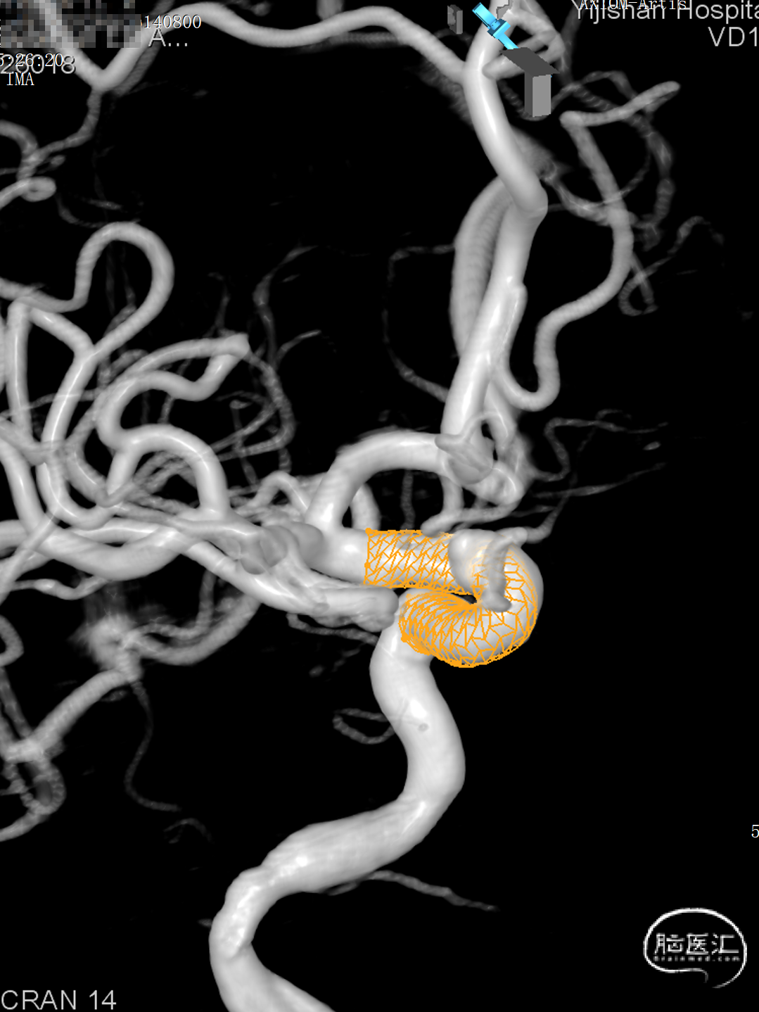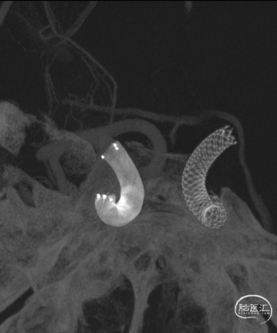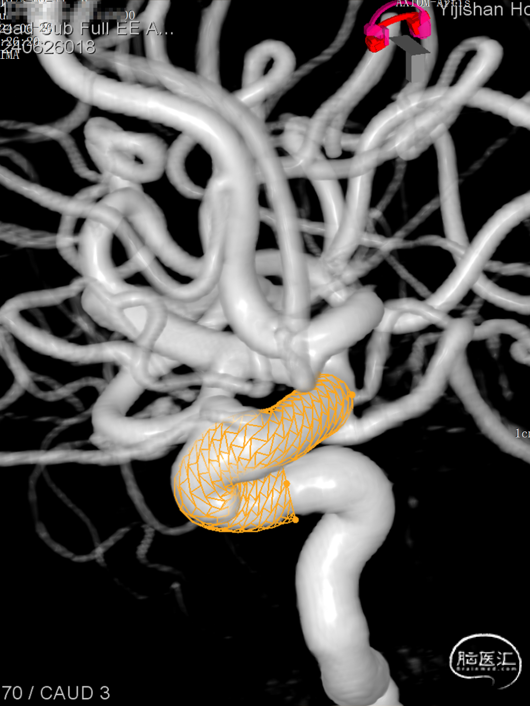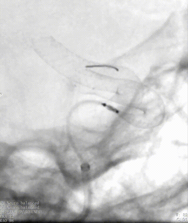 术后血管造影见动脉瘤仍有显影,瘤腔内造影剂滞留,支架展开,贴壁良好,载瘤血管血流通畅,手术顺利。