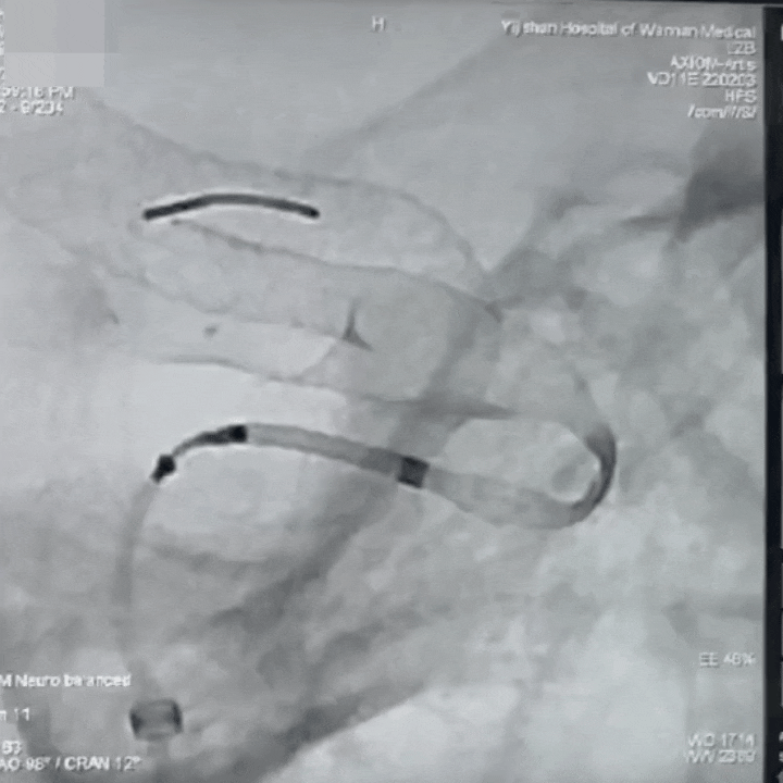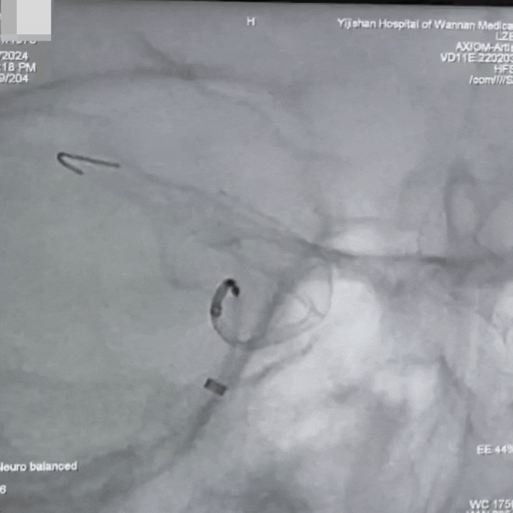 迂曲段通桥麒麟™血流导向密网支架释放过程。